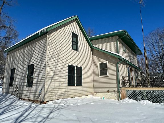 Opportunity awaits on this beautifully wooded 8 acres, with Fish Hook Lake view. Only 6 miles to town. This older home has main floor bedroom, full bath, kitchen with wood free standing fireplace, huge living room, sunroom (can be used as a dining room) which leads out to front deck, and nice sized foyer with laundry. The family room is upstairs with 3 more bedrooms and a full bath. There is a partial basement that was finished at one time. There is a triple detached garage and other sheds for storage. With over 2300 finished square feet, this home has so much potential. Being sold as is.