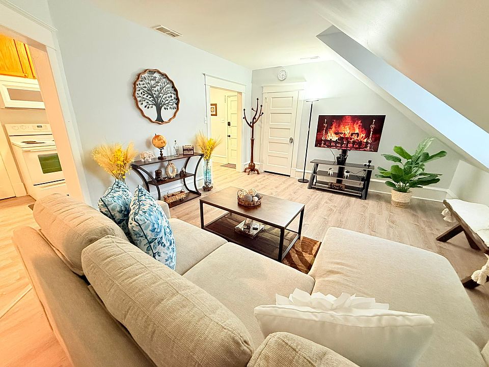 Experience the perfect blend of style and comfort in our thoughtfully designed home in Wilmington. Our home is situated in a beautifully restored historic building, offering a unique combination of classic elegance and contemporary amenities. Large windows flood the nearly 800 sq. ft. space with natural light, while the modern air conditioning ensures maximum comfort. The living area is furnished with a comfortable sofa bed, flat-screen TV, and tasteful decor, perfect for relaxing after a day of exploration. The 1 bedroom promise restful nights, with 1 queen-size beds, dressed in hotel-quality lines. Equipped with its own flat-screen TV for added convenience. Large office space off the bedroom with door for privacy. Direct LAN internet wire for business purposes. Also great for social media creators. The home comes complete with complimentary toiletries, towels, and essential amenities such as washing machine, dryer, and ironing facilities. The kitchen maintains its historic charm and includes essential appliances such as a refrigerator, stove, and microwave. A dining table for 4 offers a cozy spot to enjoy your meals. 31 plus days or more lease like negotiable. This unit is fully furnished. No smoking and no pets allowed.
