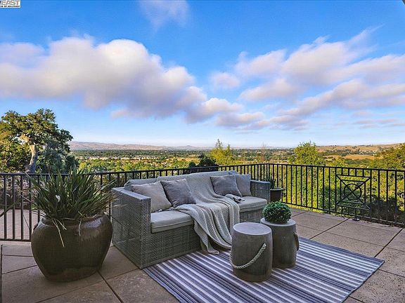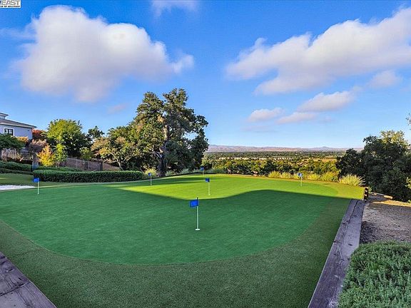 Sweeping views and exceptional privacy define this custom estate at the end of a quiet cul-de-sac in Pleasanton’s prestigious guard-gated Golden Eagle community. Set on nearly an acre and backing to permanent open space, the property offers unobstructed vistas of Mt. Diablo, Pleasanton Ridge, and the scenic valley. The main level features a luxurious primary suite with backyard access, a private home office, and a guest suite—ideal for multigenerational living or guests. The chef’s kitchen boasts cherry cabinetry, granite countertops, and high-end stainless appliances, opening to a dramatic family room with walls of windows and abundant natural light. Formal living and dining rooms offer elegant entertaining spaces, enhanced by custom finishes and a built-in wine closet. Upstairs includes two spacious en-suite bedrooms and a large bonus room with full bath—perfect as a fifth bedroom, media room, or playroom. A 4-car garage provides generous storage and flexibility. Outdoors, enjoy stone patios shaded by mature oaks, a private putting green, and serene surroundings—all just minutes from downtown Pleasanton, top-rated schools, and commuter routes.
