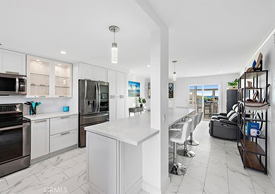 Panoramic ocean views and extensively remodeled, this ground-level one-story condo is among the very finest within the Faire Harbour community at Marblehead in San Clemente. Ocean views reach all the way to Catalina Island and extend over city lights, romantic sunsets and a sprawling lawn. A custom-enclosed patio and its adjoining outdoor patio perfectly frame ocean views for sublime entertaining, while reconfigured indoor spaces now boast an open-concept design with two bedrooms and two baths in approximately 984 square feet. Virtually custom, the new kitchen shines with quartz countertops, an L-shaped island with bar seating, white Shaker cabinetry, new stainless-steel appliances and a pantry for convenient storage. A corner fireplace lends style to the living room, which opens to the patios. Both baths are fully upgraded with floor-to-ceiling tile and new fixtures, and the primary suite offers ocean views, a walk-in closet with built-in organizers, and patio access. Luxury vinyl tile flooring, new contemporary lighting fixtures, a guest room murphy bed, washer and dryer set, and a new water heater are included. The detached two-car garage is fully enclosed and finished and hosts an abundance of cabinetry. Faire Harbour at Marblehead is set among rolling coastal hills and rewards homeowners with verdant open space, a sand volleyball court, and a resort-style swimming pool with spa. The Outlets at San Clemente are located just across the freeway and feature luxury theaters, premium shopping, yoga, a bakery and a variety of restaurants. Beaches, excellent schools and San Clemente’s picturesque pier are only minutes from home.