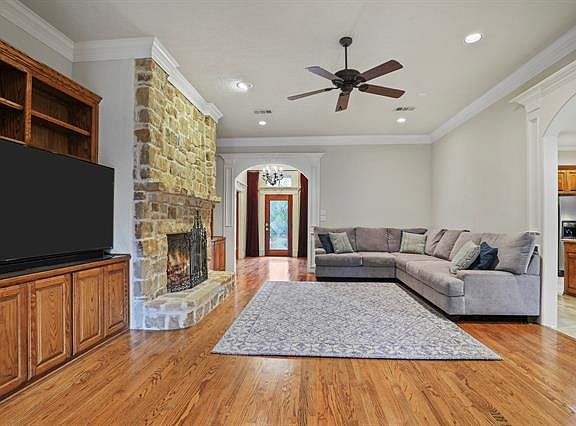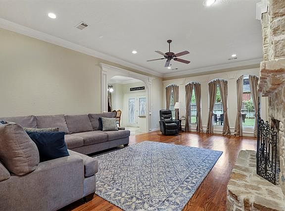 This executive 2 story home in desirable Kings Mill, built by Signature Custom Homes, has 4 bedrooms, 3.1 baths, 2 car swing entry garage. The home features large bedrooms, hardwood floors, wood windows, granite counters, study, stone fireplace, reinforced safe room with a phone line, large backyard and spacious covered patio. Living room with beautiful built-ins is open to the kitchen and dining area. Ideal location and price for this highly sought after neighborhood in Mansfield with access to the top-rated schools in MISD. Kings Mill also offers easy trail access to next door Oliver Nature Park. The neighborhood offers sidewalks, open green space & pond. Roof replaced December 2018.