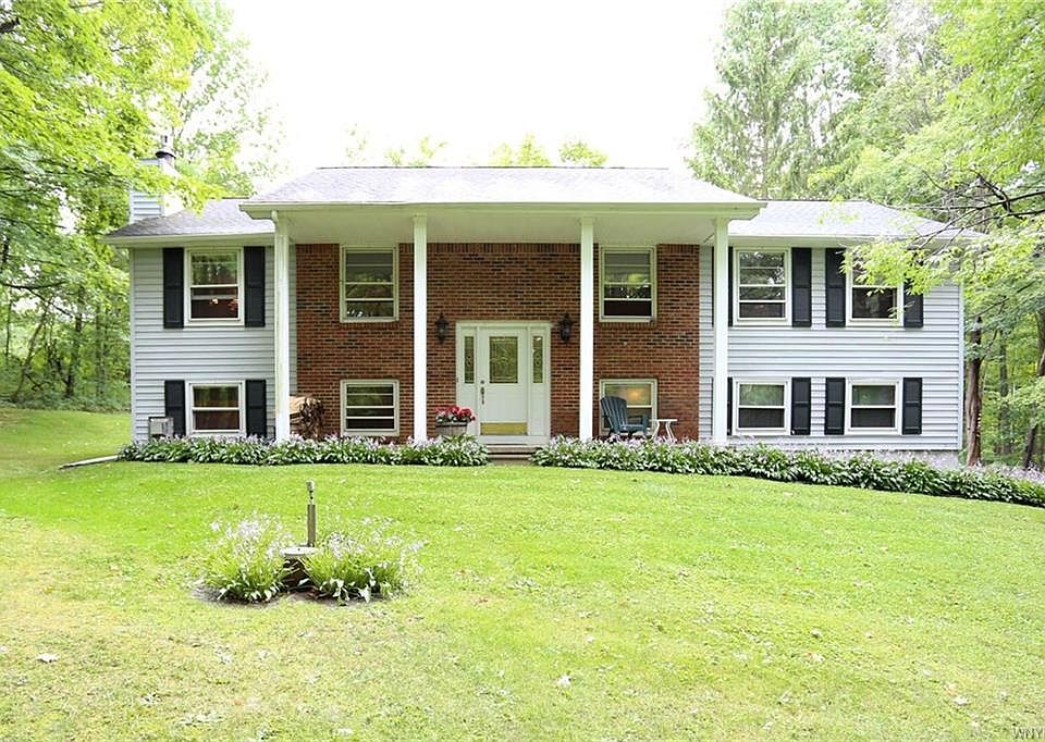 To schedule a private showing and if purchased receive a $1000 rebate check towards your closing cost at closing call for details. Contact the listing agent Tom with New York State Realty at 716-310-3102. Priced to sell at 20,000 below appraised value this one of a kind gem nestled in a private park-like setting in the woods elevated on 3.14 acres w/ a brand newly dry walled 2.5 attached garage. Upper rear wrap around deck with motorized awning. Large waterfall featured w/ extensive maintenance free landscape perennials. 8 seat hot tub w/ gazebo included. Elaborate full powered chicken coop with copper coupela that lights up. Outhouse with electric power in it by fire pit in rear of yard. Tree stand in woods that has cable and electric/microwave. Updated kitchen, hardwood diagram floor, Roof 7 yrs, Low taxes, E. Aurora schools. This house won't last!