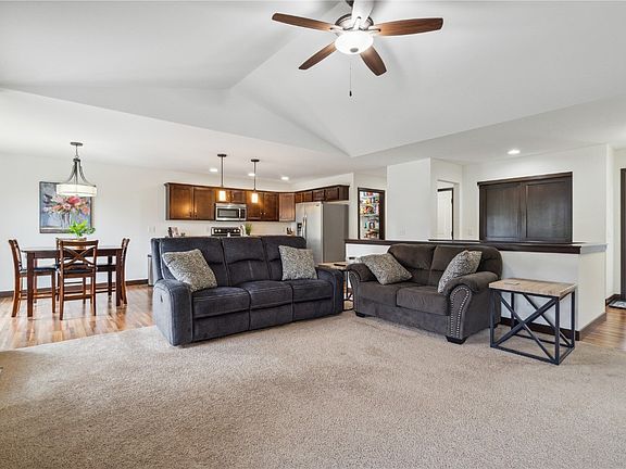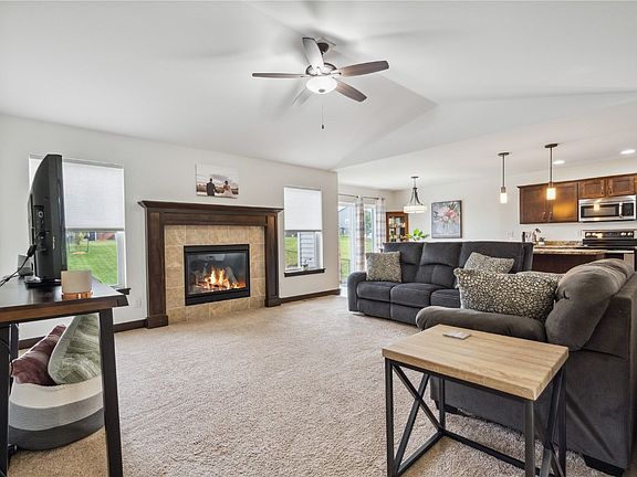 Tucked away on a quiet street, this beautiful 6-bedroom ranch was designed with your family in mind! Located in the desirable Westwind Creek neighborhood and College Community School District, you’ll enjoy swift access to I-380, parks, walking and biking trails, restaurants, and Target. On the main level you’ll find the space is thoughtfully laid out with an open concept design. The living space is sundrenched by south facing windows and complemented by a vaulted ceiling, bright white walls, and a cozy built-in fireplace. The kitchen features a center island, ample cabinet space, stainless steel appliances, and an adjacent dining space that walks out to the back patio. The primary bedroom features a sizeable walk-in closet and luxurious ensuite with soaker tub, walk-in shower, and dual vanity. Your 1st floor laundry + pantry combo, 2 other great-sized bedrooms, and full main bath complete the main level. The basement is truly an oasis, recently finished, adding even more living space and entertainment options to this already magnificent home. The LL features 3 roomy bedrooms, an additional living space, and attractive radius wet bar, equipped with a full-size fridge, dishwasher, sink, and gorgeous grey cabinets accented with modern black hardware. Plus, the newly installed basement bathroom features a separate room for the tiled walk-in shower and toilet, adjacent to the dual sink vanity and storage shelving, ensuring functionality and style. Enjoy a cold beverage this summer on your back patio, admiring your luscious green lawn and spacious backyard. The lot is fully complete with 5 newly planted trees and recently installed retaining wall, waiting for your favorite plants to be added. You’ll love the gorgeous stone and siding, newly upgraded insulated garage door w/ windows, and beautiful front yard landscaping. Additional new upgrades to home: blinds throughout entire home, fresh paint in living room and basement, patio steps, kitchen oven and dishwasher, garage cabinetry, thermostat, and heavy-duty utility closet shelving. Don’t miss your chance to own this spacious, exceptionally loved home!