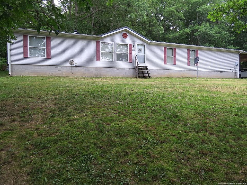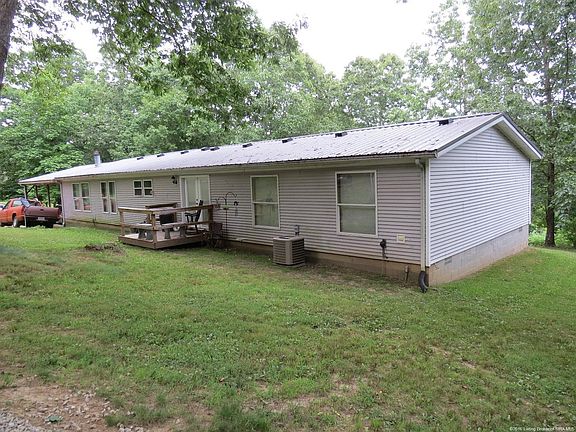 Well maintained double wide-manufactured home. Three bedrooms, two bath. OPEN-CONCEPT!! Large living room, and family room. A den that could be used as a fourth bedroom if needed. New flooring throughout. Wood burning brick fireplace. Central air. Master bedroom w/large closet. Master bathroom has garden tub, tile flooring. Nice kitchen that boasts of many cabinets, and an island. French doors from the dining room out to the back deck. Storm cellar in the back yard. Poured solid-concrete with block foundation. New roof. Minutes to Patoka Lake.