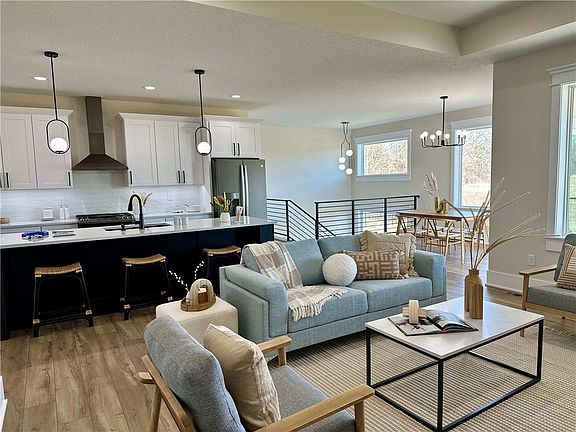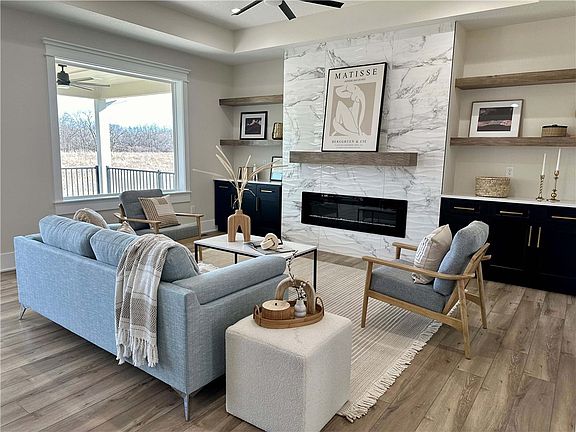 The contemporary appeal of this beautiful ranch floor plan provides function and design with top notch finishes and no backyard neighbors! The main floor has a large open feeling with lots of windows, LVP wood flooring and modern accents. Off the oversized garage is a mudroom with two toned bench and closet, walk through laundry into the large primary suite. The wide entry hallway walks you into the kitchen with walk-in pantry and 10' kitchen island overlooking the living room with linear electric fireplace and built-in cabinets. White kitchen cabinets line the 12' wall with a striking black island under the white quartz top. Off the dining room walks you onto the covered deck and just below is a patio with a walkout on the daylight staircase. Entertain or relax in the fabulous basement family room with bar area. Plenty of room with two additional bedrooms and bathroom while still leaving a good area for future finish or bonus storage. Located in the popular Heritage development, this home is close to schools, restaurants and the new sports and entertainment hub. Check with our preferred lender for great closing cost/rate buy down options!
