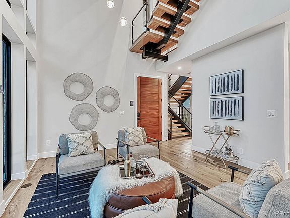 Brand new, custom home just 1 block north of Sloans Lake. Urban luxury is maximized throughout this home with soaring ceilings, tons of natural light, floor to ceiling street front windows, 8” wide plank, real hardwood oak floors. Gourmet kitchen with Monogram built-in refrigerator/freezer, a 6 burner range with double oven, and large island with Montenegro Della Terra Quartz and a waterfall edge for entertaining. Butlers pantry connects the kitchen to the front dining area. Front dining room has 3 story street facing glass with a tall cascading chandelier. Main level office has a private entrance. Two main floor outdoor spaces, one space is covered and has walls on 3 sides for weather protection with a gas hookup. The back patio is adjacent to the great room, connected with a large 12’ folding accordion door. The great room with vaulted ceilings has a large gas fireplace with a floor to ceiling surround tile. Beautiful custom lighting selections. 8 ft doors throughout the main floor. All main floor and vaulted windows are pre-wired for remote automated window coverings. Custom carpentry wall accents. Second floor primary suite highlights include a large walk-in closet, double floating vanity, standalone tub, and a curbless steam shower with 2 rainfall shower heads. Two additional bedrooms on the 2nd floor are both en-suite. Loft could function as guest quarters, has a wet bar, and full bathroom, connected with another 12’ folding accordion door to a large partially covered deck that is highlighted with mountain views and an outdoor fireplace. 3 HVAC systems. Abundant storage closets and tucked away storage areas. 3-car detached garage with expansive loft for additional storage.
