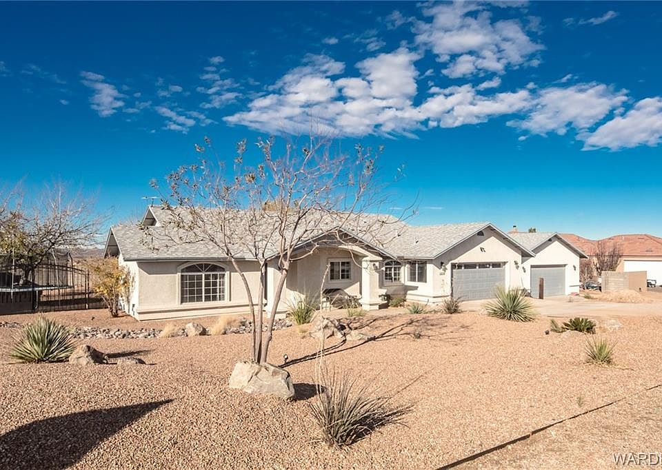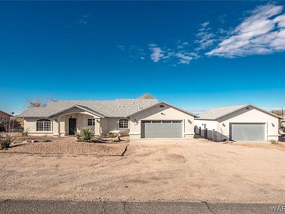 Beautifully landscaped 3 bedroom 2 bathroom home located in the scenic Hualapai Foothills Estates. Home sits on a 1.04-acre lot with plenty of room for horses and an RV. Mountain views to the east and amazing city views in the west. Home features an attached 2-car garage with an additional (framed for drive through door) detached 24x36 garage with a 10ft door. Inside the home you will find, vaulted ceilings, granite kitchen countertops, a breakfast bar, a large kitchen pantry, laundry room, office nook, corner fireplace and surround sound. Master suite has a walk in closet, jetted tub, and a door to the back patio. Large French doors from the living are open to the patio overlooking the city lights. Landscaping in the front and back yard are fully irrigated and beautifully lit with landscape lighting. Fascia on house & detached garage are being painted in the coming weeks.