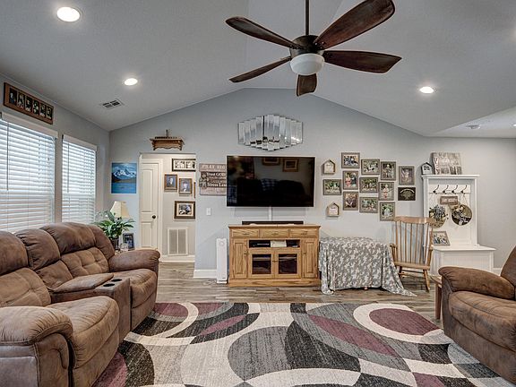 Welcome to this stunning custom-built home, featuring a desirable open floor plan with 4 bedrooms and 2 full baths. Enjoy a spacious living room, kitchen & dining area combo, with eat-in bar, and a reinforced pantry, secured with a steel door the owner's use during severe weather. Take advantage of the efficient utilities with a net zero solar panel system, triple pane windows and natural gas heating. Feel safe and secure with wired security cameras, and a privacy fence creating a peaceful backyard retreat. Situated on nearly half an acre, the spacious yard & patio is ideal for outdoor relaxation. The beautifully landscaped yard includes an additional corner patio, with fire pit area, perfect for entertaining. Enjoy plenty of space with a 3-car attached garage and a backyard shed for all your extra storage needs. Excellent location; convenient to town, schools & local amenities. Don't miss out on this exceptional home! Call to schedule your private tour today!