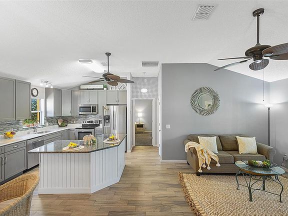 Welcome Hone to this beautifully updated Catalina II model home nestled on a spacious oversized corner lot in the highly sought-after Village of Santo Domingo. This charming 2 bedroom, 2 bath home features a desirable split floor plan and soaring vaulted ceilings, offering a bright, open, and airy living space. You'll love the front screened patio to enjoy your morning coffee and say hi to the neighbors. Step inside to find a fully renovated interior featuring luxury wood-look tile flooring, fresh carpeting in the bedrooms, and a modernized kitchen and baths with stylish finishes throughout. The stucco exterior adds to the home’s curb appeal and durability, while upgraded insulation and a solar exhaust fan in the 2-car garage enhance energy efficiency. Enjoy relaxing in the rear lanai with insulated windows, perfectly situated on the north-facing side of this home—ideal for year-round comfort. The garage door has been upgraded with hurricane safety in mind, giving you peace of mind during Florida's storm season. Key upgrades include: * New Roof (2023) * HVAC approximately 4 years old * No Bond Located just minutes from Spanish Springs Town Square, you’ll love the proximity to shopping, dining, golf, and all the amenities The Villages has to offer. Don't miss your opportunity to own this move-in ready home in a fantastic location with modern upgrades and low-maintenance living. Schedule your private tour today! CLICK ON THE TOUR 1 LINK above TO VIEW THE VIDEO FOR THIS AMAZING HOME !