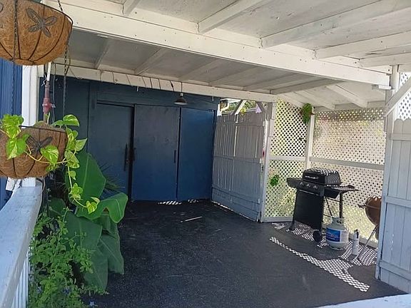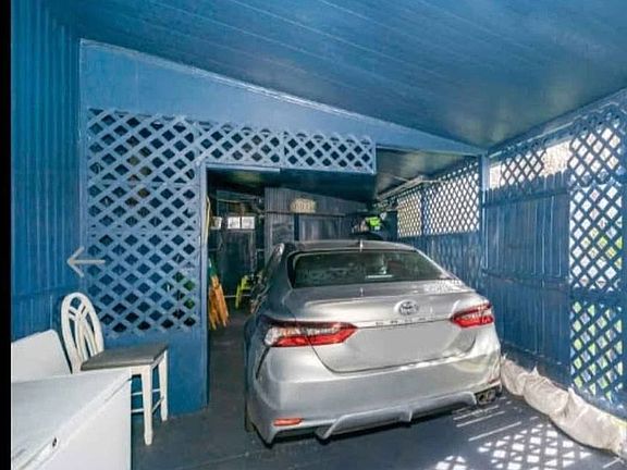 I love the fact that the house has the carport in one side and the porch in the other and has two sheds for storage one in the carport one behind .