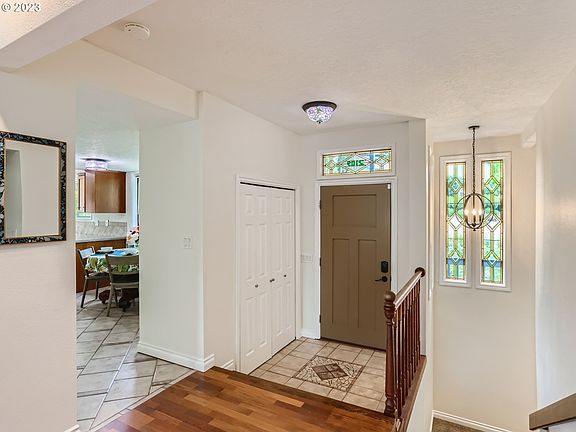 Spacious traditional home on a large, nicely landscaped lot. Desirable, quiet neighborhood on a cul-de-sac. Territorial views and seasonal river views. Features welcoming foyer with large closet. Hardwood floors in spacious living and dining room. Vaulted ceiling in living room. Large windows let in plenty of light. Generous nook in kitchen area boasts a large pantry. Roomy kitchen awaits your personal touch. Fresh interior and exterior paint. Newly remodeled bathrooms on main floor. Newer, huge deck off of dining room with steps to private backyard makes the perfect entertaining space. Three bedrooms including primary on main and fourth bedroom on lower level. Great potential for multigenerational living or possible ADU. Two wood burning fireplaces. Two large bonus/family rooms in daylight basement with wet bar and easy access to backyard. Full bath in basement. Plenty of storage throughout. Laundry room on main. Oversized two car garage with EV charger. Blocks to elementary school, walking path along river and shopping/services and deeded Willamette River access. Seller to provide 1 year home warranty. Buyer to verify schools.