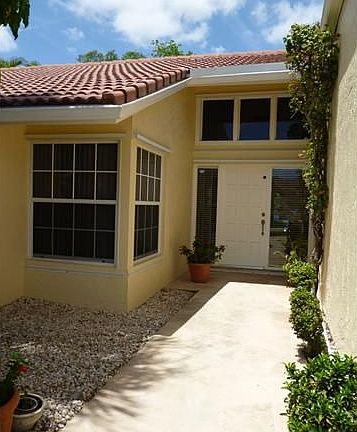 Updated pool home in tropical setting with private guard gated entrance and excellent schools ! From the moment you enter, you will be captivated by the style of this home. Open floor plan, vaulted ceilings, french doors, and transom windows make this home very bright and airy. Interior upgrades include kitchen with granite counter tops and backsplash, custom pull out drawers and newer appliances. Remodeled baths with granite counter tops. Newer windows and doors. Sliders replaced w/ Fr...