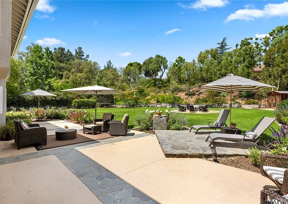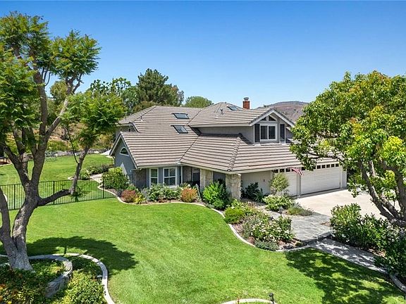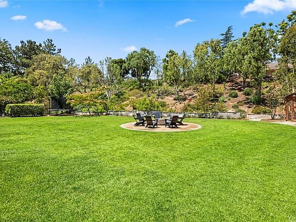 One of the most incredible park-like backyards you will come to find with the ultimate in privacy and serenity! Set high in the hills of Yorba Linda on one of the most desirable cul-de-sac streets offering a serene natural setting on over a sprawling half acre of land. Drive up to picture perfect appeal and open the doors to a Hallmark moment. Transitional farmhouse feel with gorgeous white oak flooring, striking wrought iron staircase with natural white oak handrails, designer 100% wool carpet, neutral paint, vaulted ceiling and completely open light and bright living. Large updated open kitchen boasts a wall of windows bringing the outdoors in, plentiful meal prep counter space, stainless appliances and sleek granite countertops. Casual dining nook and family room are warmed by white brick fireplace with French doors opening to your very own backyard escape. Expansive primary suite is entered through double doors offering bedroom-sized retreat or 5th bedroom, updated bath with separate tub & shower, dual vanities & walk-in closet. Three additional bedrooms each offer their own personality, with one of the bedrooms down and one bonus-room sized bedroom upstairs with high beamed vaulted ceiling! Outdoors is where the real fun begins! It is an irreplaceable Southern feel with beautiful trees, fragrant flowers, an endless lush green lawn including your very own chicken coop. Family and friends will want to spend every night gathering under the stars by the fire pit telling their favorite stories. This is a yard that is a Unicorn and will create priceless and unforgettable memories and experiences. Newer windows and doors, whole house reverse osmosis water system, contemporary light fixtures, numerous skylights, plus a 3-car garage wired for EV and expanded driveway completes the perfect picture. Completed architectural plans for backyard casita, California room and pool & spa. Just a short stroll to San Antonio Park and attends Travis Ranch K-8 and Yorba Linda High School.