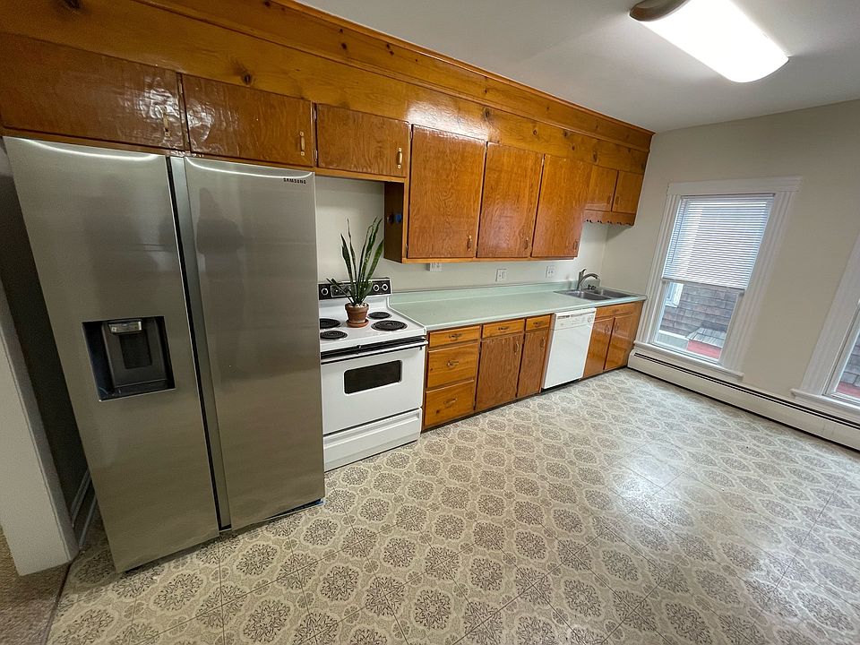 Available in a quiet building is this three bedroom, one bathroom apartment located on the second floor. The unit features an exterior porch, new carpet, fresh paint. through out, laundry hook ups, new stainless refrigerator, off street parking... Utilities included are: trash, sewer, lawn care and common space snow removal. The property is pet friendly - additional fees apply. Rent is $1,200 per month. Security deposit is $1,200. Renter is required to carry renters insurance.