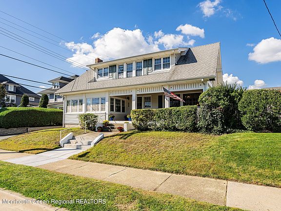 This rustic seaside classic beach house features 4 + bedrooms, 1 1/2 baths, living room, dining room, sun room, kitchen and bedroom on first level. Upstairs has 3 more bedrooms and a bonus room. Perfect beach home with an open front porch, hardwood floors, wood burning fireplace, yard and garage just waiting for you to start creating your own happy memories! 1.3 miles to either Bradley Beach or Belmar NJT train station for easy commute! Amazing location only 3 blocks to the beach with views of Shark River from front porch and upstairs. 50'x70' lot.