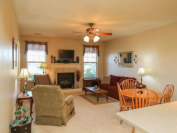 This is a 1st Floor Unit! Gas fireplace in Living Room. Lovely kitchen with Corian counter tops & breakfast bar! 3 year old appliances - Refrigerator, Microwave, Electric store (glass top). Master bedroom w/walk-in closet & En Suite! Bath has been updated with walk-in shower with seat, newer bath vanity with hard surface. Attached garage with extra refrigerator in garage. Nice size laundry! 2 coat closets - one at front, one by laundry. Patio area with lovely view of countryside! Close to gazebo, outdoor grills, car wash.