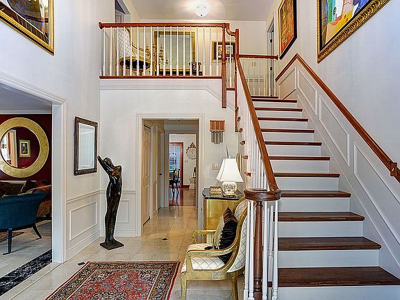 Highly detailed 6000 square foot French Colonial on over 6 acres in most desirable neighborhood in Treasure Lake. Shouldice stone exterior, solid wood and marble flooring throughout. High end materials in kitchen and baths: commercial stainless appliances, granite counters, solid cherry cabinets, and eat in kitchen area with attached open concept family room. Adjacent 3 season sun room and powder room. Office with built in cabinets, marble dining and living rooms, and 2 story foyer. 4 Bedrooms, 3 with en-suite bathrooms including master with 2 walk in closets. Walk in in attic storage and 2 zone heating/AC. Basement fully finished with bamboo flooring, wet bar, and movie theatre with 100 inch screen, Large laundry room and workshop as well with dog run. Fully landscaped with paver stones, grill, and fire pit. Additional detached carriage house with attic storage, fully finished and hold 5 cars, more with lifts from high ceiling. Home sits on 3.4 acres with an adjacent 2.6 acre lot that can be subdivided for another home.