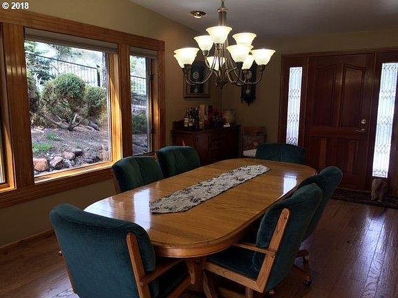NICE FAMILY HOME! Canyon Mt views, custom cedar sided, open floor plan, kitchen Oak cabinets, recessed lighting, bar, tiled counter tops & dining room, living room w/slider onto deck, utility area, 3 bed, 2 bath, wood & electric heat, wood, carpet & tile flooring, landscaped w/water fall, concrete walks, wood & custom iron fencing, mature Pine trees, deck w/outdoor kitchen, storage shed, garage, double entry driveway. $249,000 #954