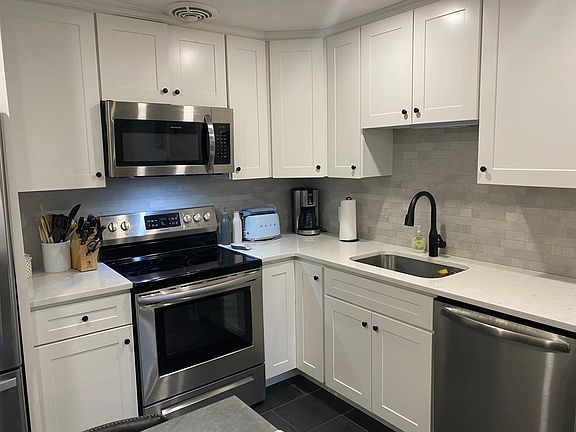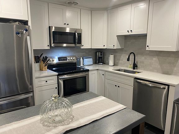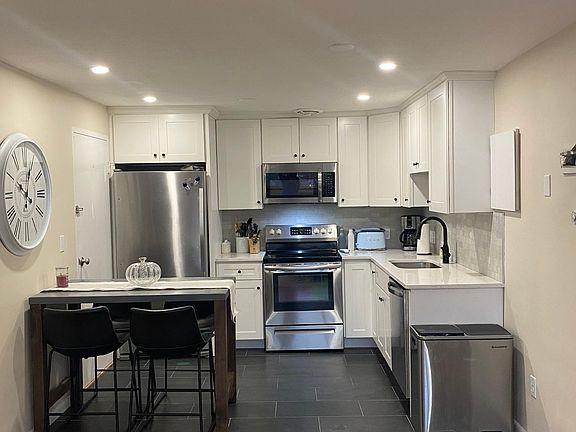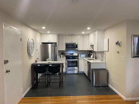 Newly renovated 2 bedroom 1 bath top floor condo available 8/1/2022. Renovated kitchen and bathroom includes high-end upgrade. Open floor plan with a living/dining combination. Two large bedrooms with ample closet space. Recessed lighting throughout. Freshly painted and custom blinds. Heat, hot water, and sewer all INCLUDED in rent price. Small to Medium sized dogs and cats allowed ($25.00 charge per month). Limited to 1 pet. One deeded parking spot. Apartment is a short distance to the commuter rail, Starmarket, Centre st shops and restaurants, Millennial Park, and all major highways. Good credit required.