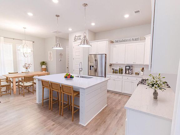 Don't miss this beautiful 4 bedroom home located on the pond in desirable Grand Bees! Built just four years ago, this stunner features 10' ceilings on the 1st floor, double front porches, a fully fenced in backyard, two car garage & tons of upgrades! You'll love the laminate hardwood floors throughout the main living area, and chef's kitchen complete with a gas range, beautiful white cabinetry, SS appliances, quartz countertops & an oversized island w/bar seating. The spacious primary suite with private bath along with the laundry room are located on the first floor. Upstairs you'll find a large loft, 3 additional bedrooms each with a walk in closet and a wrap around balcony off of the loft. Washer, dryer & the fridge convey! Private corner lot, low HOA w/a pool & no flood insurance req!