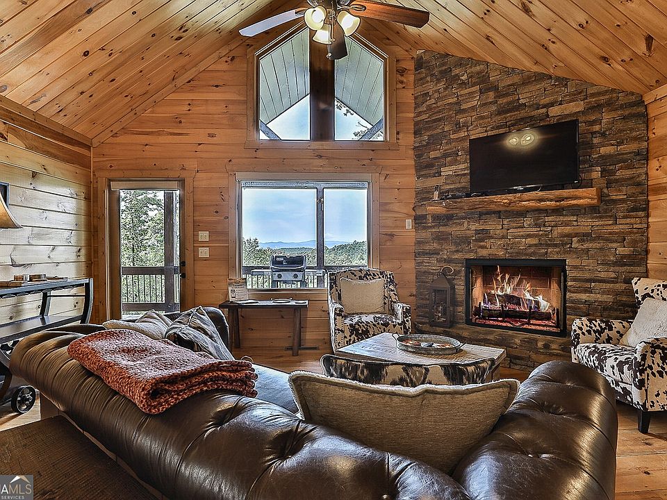 **Mountain Retreat with Breathtaking Panoramic Views in North Georgia** Welcome to your dream cabin retreat, where stunning long-range mountain vistas await. This charming mountain home is designed for comfort and elegance, featuring upgraded stainless-steel appliances and soaring cathedral ceilings. The spacious great room is beautifully enhanced by impressive fixed glass windows that invite natural light and frame the picturesque surroundings, all anchored by a magnificent floor-to-ceiling stone fireplace that creates an inviting atmosphere. The expansive master suite offers a luxurious walk-in tile shower, adding a touch of sophistication to the home's character. The finished basement is a versatile space that includes a large den, perfect for a second living area or game/media room. This level also features a wet bar, an additional bedroom, and a bathroom, all with private access to a tranquil lower patio. Step outside to enjoy the serene mountain vistas from your expansive sitting area and back deck, conveniently accessible from the living room and both bedrooms. Set on 1.07+/- wooded acres with usable terrain, this property includes a spacious fire pit area, ideal for gathering with friends and family. Centrally located between the vibrant towns of Blue Ridge and McCaysville, this cabin offers the perfect blend of seclusion and accessibility. Experience the ultimate escape in your mountain getaway today!