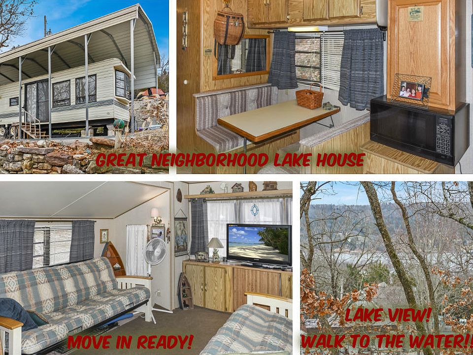 COZY LAKE VIEW HOME, WALK TO THE WATER, EXTRA LARGE LOT! Pretty Park unit under an 20x36x18 Polebarn carport, move in ready. Nincely decorated, Neat, Clean and well kept, includes furnishings and 37' tv. Efficient Kitchen includes a gas stove and oven, good amount of storage. Living room is surrounded by windows and a sliding glass door for lots of light. Jellystone Park is a great neighborhood that includes a Club House, Swimming Pool, Tennis Courts, Boat Launch, and Playground. Use this unit as a vacation home or build something new on this extra large lot. Beautiful winter Lake view, Lot sits high above Table Rock Lake on a dead end road.