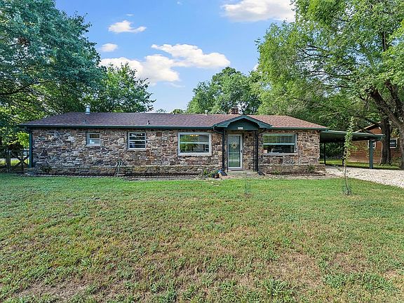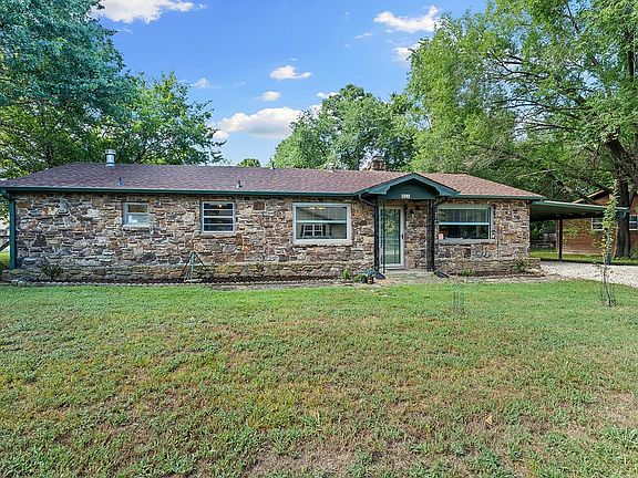 Charming rock home on a quiet corner lot minutes to downtown, the aquatic park, and Hwy 62. Light-filled living room with custom rock fireplace opens to a sitting area and the kitchen/dining with white cabinetry, modern hardware, ample counters, and a gas range. Oversized primary bedroom with half bath and walk-in closet; two additional bedrooms and a full bath with double vanity. Enjoy a large screened back porch overlooking mature trees. Insulated flex/utility room off the porch adds storage or potential office/guest space, plus an insulated 8×12 shed. Recent updates include roof, gutters, gravel drive, windows & blinds, attic insulation, storm door, HVAC (AC & furnace), security/internet systems, landscaping, and fixtures. Appliances convey; select furniture may remain.
