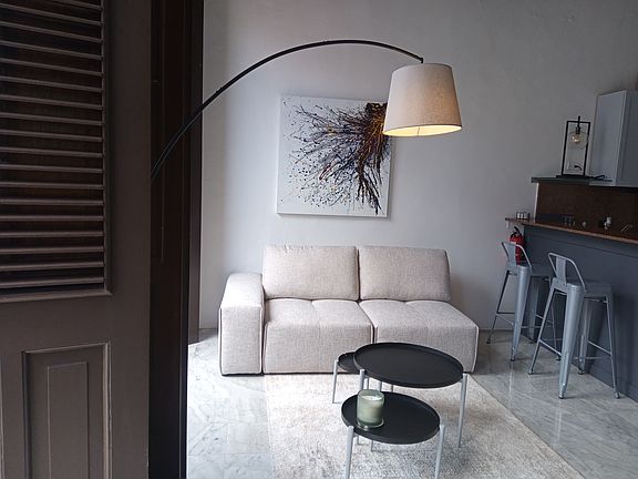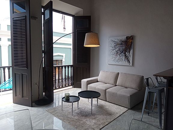 Lovely 1.5 bedroom in a beautiful and perfectly maintained historic building in the heart of Old San Juan. 2nd floor with elevator. Fully equipped and in pristine condition. Huge living room with open kitchen. Inundated with light. Balcony. One bathroom, one bedroom and an additional bedroom in mezzanine. Two queen beds. AC, internet and TV. Washer-dryer in the apartment. Back-up generator. Utilities included Minimum 6 months lease, preferably one year.