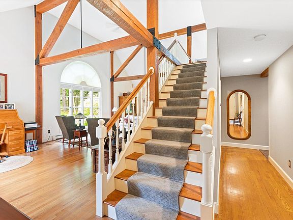 Custom built post & beam contemporary situated on a picturesque 2 acre site. A bright impressive interior featuring spectacular LR with 2 story Palladian windows, beamed cathedral ceilings and open concept dining area. Large gourmet kitchen with state of the art appliances including Wulf gas stove and a walk-in pantry. Family room with fireplace open to kitchen. Impressive primary bed suite w/window seat, 2 walk-in closets, spacious bath w/dbl sinks + lg tile shower. First floor bed or office and large mudroom off the 2 car garage. 34' porch for entertaining overlooking the professionally landscaped yard with easy access to the rail trails. Wonderful rec room in lower level, central air, new roof, septic, generator + irrigation system. This lovely home is in mint condition with easy access to downtown Keene. Great curb appeal set back from road. Delayed showings till Monday 7/31/2023
