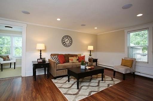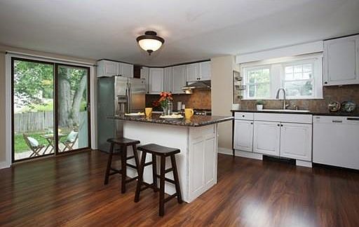 This lovely 1880 home in Wayland combines the antique charm of yesteryear with the modern amenities of today. Enter through the newly tiled mudroom and transition into all the warmth this colonial has to offer. The updated kitchen contains new flooring, a granite island, stone tile backsplash, gas stove, white cabinets, and a slider accessing the backyard. The living room is expansive and runs front to back, allowing ample room for dining and entertaining. There is also a separate playroom on the first level. Upstairs, the 3 bedrooms have original pine board floors and old world allure. The master bedroom suite has a sitting area connecting to the master bath, along with an impressive walk-in closet containing 2 full size windows. The fieldstone basement houses a new Weil McLain gas boiler for efficient heating. The walk-up attic features a large space offering expansion opportunity. The home is situated a short distance from local schools, restaurants, shops, and conservation land.