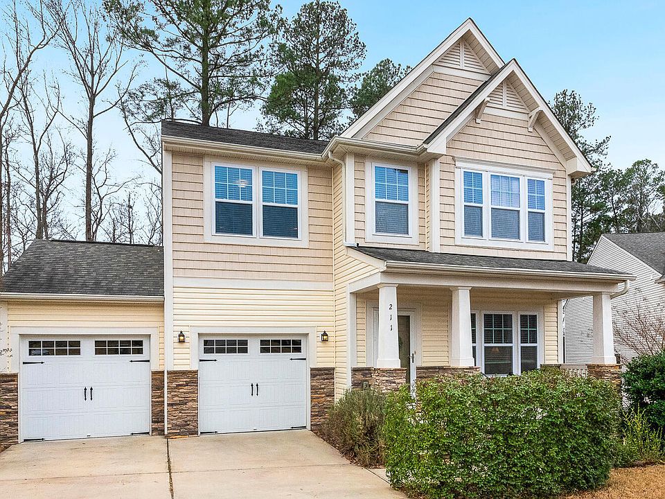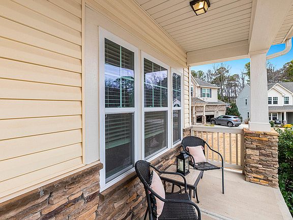 Welcome to this stunning home in the desirable Morrisville neighborhood of Sterling! As you enter, you'll be greeted by a spacious foyer featuring warm hardwood floors that extend throughout much of the main level. The kitchen is a chef's dream, with stainless steel appliances, granite countertops, a large center island with seating, and elegant crown molding on the cabinets. The family room offers a cozy fireplace surrounded by custom bookcases, while the dining room is perfect for entertaining with its tray ceiling and wainscoting. The main floor also includes a home office, mudroom with drop zone, and a powder room. Upstairs, the owner's suite is a serene retreat with a tray ceiling, walk-in closet, and an en-suite bath with a double granite vanity and tub/shower combo. Two additional bedrooms, a full bath, laundry room, and a bonus loft area complete the second floor. Enjoy peaceful wooded views from the back deck, perfect for unwinding. Located on a quiet cul-de-sac, this home offers privacy with easy access to community amenities, including a pool and tennis courts. Just minutes to Brier Creek, Research Triangle Park, RDU Airport, and major highways, this home is ideally situated for convenience.