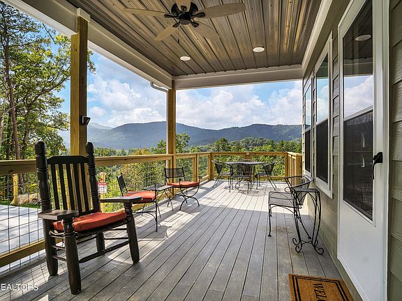 New Home- Fall 2023! It is about the mountain views. Located on the pinnacle of Cutter Gap Ridge, this house blesses the fortunate with incredible mountain views. From every bedroom, the kitchen, dining room and living room, the sweeping landscapes of Laurel Valley and the iconic north face of Rich Mountain ...Townsend's most photographed mountain view, are enjoyed from the walls of windows. The main level has a great room with hand hewed beams and a large dry stack stone fireplace. A full washer and dryer is included. The upper level primary suite is framed with vaulted ceilings and hand hewed beams. King size bed, a separate office area or workstation, his and her closets, a large screen TV over a hologram fireplace, a separate siting area and walls of windows to enjoy the mountain scenery. Full blackout shades are available on all windows for those who wish to sleep into the morning. The lower level has a second bedroom with a king-size bed and spacious closet; also on the lower level is an alternate sleeping area with a queen size bed and additional closet. Of course, there are epic mountain views from every bedroom. From this level you access a private outdoor space with a covered whirlpool jacuzzi overlooking Laurel Valley. The adjoining sitting area is absorbed in panoramic mountain views. A fire pit with additional seating overlooks the sweeping valley. The driveway is concrete and there are three level parking spaces, a covered(Trex) deck and an open deck are on the main level along with a special outdoor grilling area. Free access to the Wild Laurel swimming pool, fitness center, and clubhouse are available to all owners/guests. Primary home, second home, or vacation rental, this one can do it all!