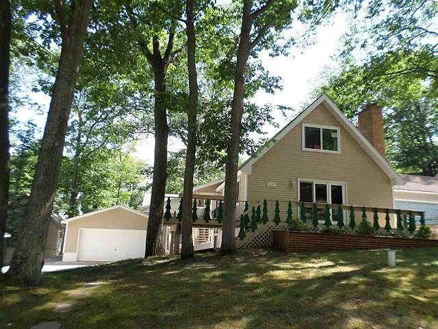 Private Lake access , docking and mooring rights to Supreme view a private beach area for members, enjoy the sandy beach area with family and friends on this huge association beach front. Chalet home 2400 SQFT, 4 bedrooms , 3 baths,, the upper floor has 2 bedrooms and full bath , the main floor consist of master bedroom suite, kitchen and dining room combo and another full bath, living room with a brick wood burning fireplace.. The lower floor comes with an walk-out basement, another bedroom and 3rd bath. Features an detached 2 car garage. Home sits high on a hill overlooking tree tops and has a slight view of the western shore of Higgins Lake.