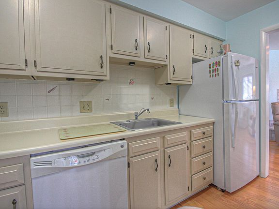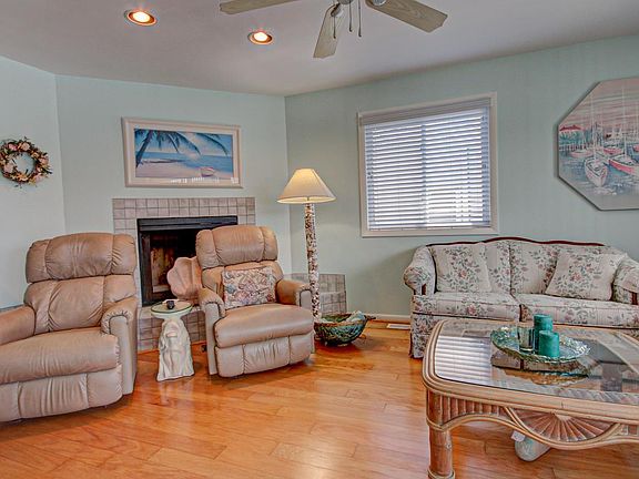 This condo is a must see, move in condition. Beautiful Encore Quarter Oak Wheat wide plank hardwood floors throughout . Newer composite decking with redone structural foundations and railings. Wall to wall front deck Anderson sliders in dining and living rooms. Wood Burning self cleaning fire place with ceramic tile hearth. 2021 improvements include a new AO Smith hot water heater, garbage disposal, washer, refrigerator and toilets and vanities in both bathrooms. Master Bedroom and second bedroom have sliders to rear deck. Storage shed in the back. This condo is a first floor unit in a quad.