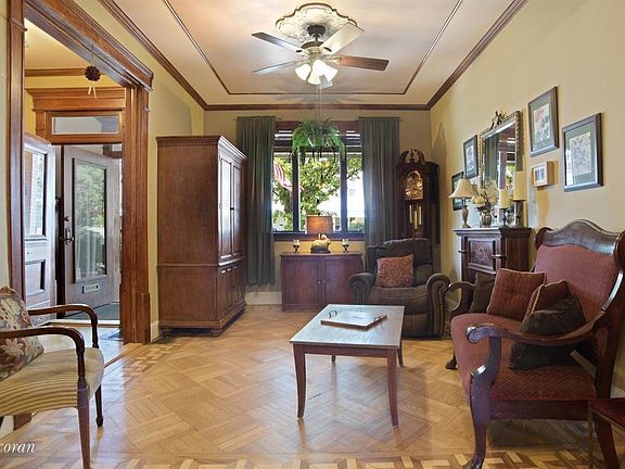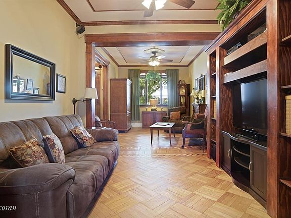 Introducing an elegant two family home with charming front porch on a very desirable, extra wide, tree lined block in Windsor Terrace. Currently being used as a one family this home can easily be converted to a high income generating two family home. All plumbing and electric are in place for an easy conversion. Upon entering you are immediately greeted by the pristine original woodwork and striking parquet floors throughout the house. This home offers a double living room that leads into a classic dining room with coffered ceilings and an oversized window. The windowed kitchen is bright and airy and has access out to your beautifully manicured backyard. This floor also includes a convenient full bathroom. Upstairs you will find the large master bedroom with beautiful bay windows, two large closets and window-seats with storage underneath. Two more bedrooms and a fully renovated bathroom with a skylight complete this floor. In addition, this home boasts a full finished basement, original Oak doors, laundry room and tons of storage. Your dream home is waiting!