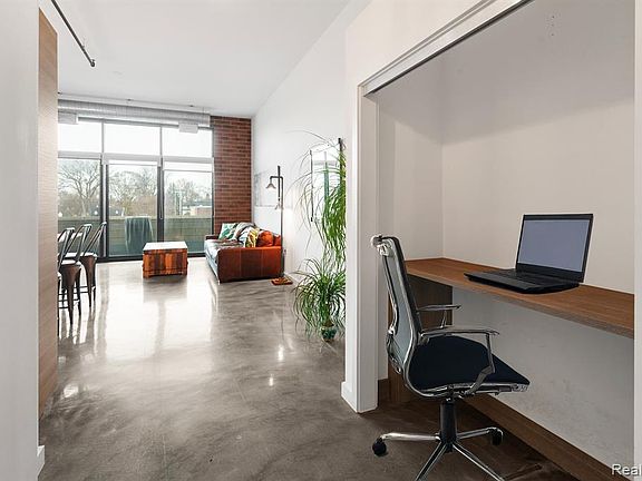Discover urban living at its finest in this stunning modern loft-style condo, perfectly situated in the heart of Downtown Ferndale. This stylish residence features a secured entrance to the Building, 1 bedroom and 1 bathroom, boasting high ceilings, exposed brick, and sleek ductwork that amplify its contemporary charm. The polished concrete flooring throughout adds an industrial touch, seamlessly blending with the open-concept design. The expansive Living Room includes the leather sofa and is bathed in natural light, thanks to floor-to-ceiling windows and a doorwall leading to a spacious South-facing balcony, prime front of the Building. Enjoy breathtaking views of Woodward Avenue and the vibrant Downtown area, all from the comfort of your unit. The Kitchen is a chef's delight, featuring modern white cabinetry, luxurious marble countertops, and stainless steel appliances. The generous Bedroom offers a tranquil retreat, complete with a large custom closet organizer, while the in-unit Laundry adds everyday convenience. The luxurious Bathroom features a vessel sink, floating vanity, custom tile & a tub/shower combination. An attached secured parking garage provides one assigned parking space, and with walking distrance to bars, restaurants, shopping, I-696, I-75 expressways, commuting is effortless. Ready for immediate occupancy, this impressive condo offers an unparalleled lifestyle in Downtown Ferndale. Don't miss your chance to live in the center of it all! Available November 1st 2025.