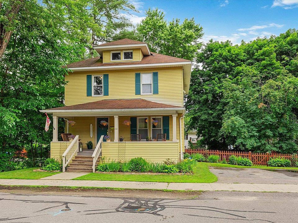 All offers due by Friday the 15th at noon. Easy in town living! This beautiful home has been given the love and care every house wishes it could get! Updates throughout but still has all the charm and character it came with. The front porch offers a welcoming entrance that leads you into a large open foyer, from there you have a spacious dining room with original built ins, the living room offers plenty of space for entertainment or watching your favorite show. The kitchen has ample counter space with a butcher block peninsula, new pendent lights, brand new stove and updated appliance. Moving upstairs you’ll find 3 bedrooms, all with fresh paint and the original wood molding that has been lovingly maintained. The bathroom had been brought back to life with its original wood floors, a tiled shower, and fresh paint. But you won’t want to spend all your time inside when you have a fully fenced in yard offering a lovely fire pit and beautiful landscaping, all of which can be viewed from the covered back porch off the kitchen. Both porches also have new roofs. All of this within walking distance of Main Street! Don’t miss out, call to schedule your showing today!