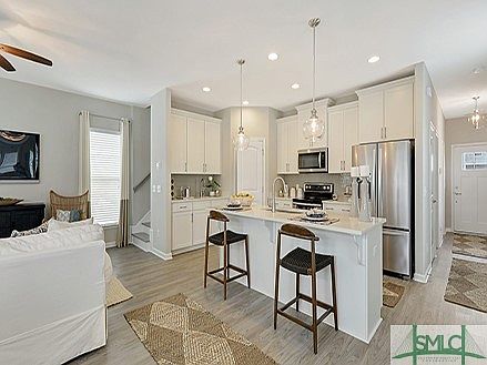 Savannah's most trusted local builder is proud to offer our Harborside plan. This 4 BR/2.5 BA home is so open with tons of natural light and gorgeous upgrades! On the main floor living spaces you'll find upgraded rigid-click vinyl wood-look flooring, while the kitchen boasts 42" tall white cabs, quartz counters w/ an upgraded single-bowl kitchen sink and tiled backsplash. All kitchen appliances are included in stainless steel - even the fridge! Upstairs you'll find all four bedrooms, two full bathrooms, and ample storage/closet space. Primary bathroom features a very large, 6' tiled shower-only as well as two sinks in a quartz top vanity. The primary suite includes a spacious walk-in closet, and a tray ceiling with ceiling fan/light! Full sod & sprinkler in yard. Completion date is estimated to be OCTOBER/31/2023. Pictures, features, and selections shown are for illustration purposes and may vary from the home built. All builder incentives applied.