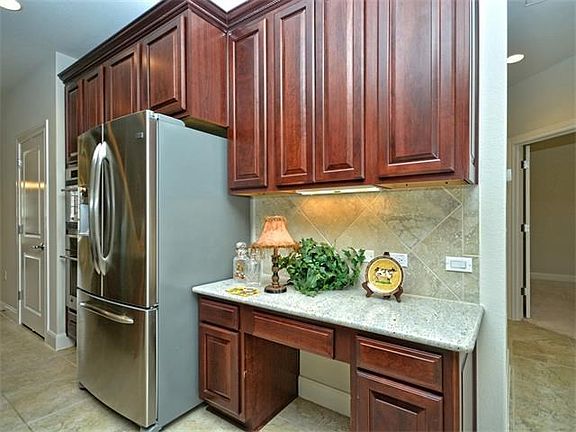 Signature Coronado Plan w 4 bedrms, formal dining, great room w gas fireplace and beautiful wooded green belt behind. 3 car garage, attic storage and appliance package(W,D,Refrig) all included! Kitchen has rich cabinetry, stainless steel appliances including 2 convection ovens along with built-in microwave. Granite counter tops, breakfast bar & charming breakfast nook w bay window. Outside back patio includes a built-in kitchen, extended stone patio, hot tub & fenced yard. Front patio has been extended.