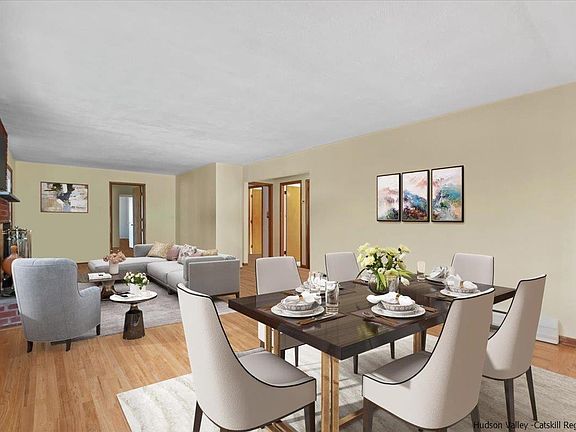 We have a very highly motivated seller who wants to be back in California ASAP. He's got this Move-in ready 1958 expanded Hurley ranch house with light-filled open feeling common areas and roomy bedrooms, all on one level. Plus the mostly finished lower level (not included in the noted square footage) has walk out doors to the yard and garage plus workshop/storage area, which can be used for a multitude of purposes. Laundry room is on this level too. This mid-Century home is located on a quiet street which ends in a cul-de-sac, and features a rear yard overlooking a large meadow and pond below, accessed off another street. The residents of this home will enjoy tranquility and security, all within minutes of the vibrant uptown Stockade District of Kingston and all that the city now has to offer. There is a definite and popular charm now recognized in mid-Century homes. This home has been very nicely maintained, is genuinely, Move-in condition, as it is, or could be seen as a gem waiting for its next owner to bring its look into the current vogue of renewed mid-century homes. The recently re-finished oak floors, brick and bluestone wood burning fireplace, and the spacious screened porch are wonderful features of the living and dining rooms. The owner recently purchased this, his childhood home, and has had a change-of-life need to relocate. That is the reason for his selling. The home was mortgaged this winter with an appraisal in file at $430,000. Carpe diem!