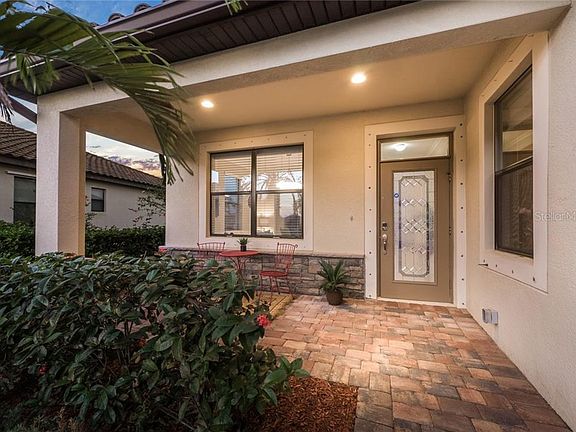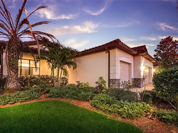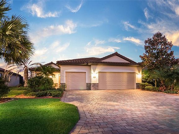 This 3 Bed, 2 Bath home has everything you'd want in an exquisite home plus the bonus of a beautiful expansive pavered outdoor space and a 3 car garage. Other special features include the most intriguing glass front door to greet you and your guests, classic diagonal tile flooring in all the living areas, crown molding, granite countertops, an abundance of cabinets and counter-space, arched pass-throughs, triple glass sliding doors to the lanai, dual sinks in master and 2nd baths, security system, stylish light fixtures and ceiling fans, whole house gutters and more! The Homeowners Association covers lawn maintenance, reclaimed irrigation, basic cable and internet, community pools, spa, racket and tennis courts, fitness center, club house and dining facilities, social events & clubs, common grounds maintenance, gated community, & manager. Centrally located with excellent schools. Minutes to shopping, restaurants, gyms, salons, night life, etc. Easy drive to downtown, Sarasota International Airport, the top-rated beaches and UTC Shopping Center, to name just a few. Schedule your showing soon as I'm sure this gem won't last.