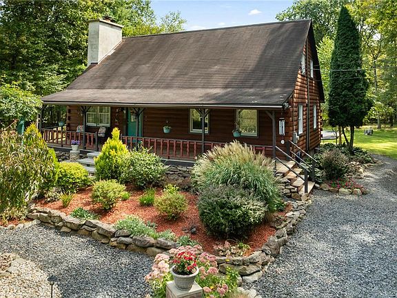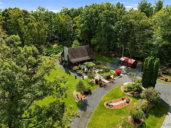 Prepare to be enchanted by this magical Log Cabin home, tucked away on 4 Acres of land in Bushkill Twp & much desired Nazareth School District! This home has been completely renovated, with only the finest materials utilized! As you approach, you'll take in the lush country setting, mature landscaping, and oversized covered front porch to enjoy the outdoors. Through the front door, you'll be invited into the impressive living room, featuring a cozy fireplace, and elevated ceilings with exposed wood beams. With a completely open concept, showcase your cooking skills in the eat-in kitchen, featuring SS appliances, center island, and flowing effortlessly into the dining area- a perfect space to host gatherings! Completing the main floor is a first floor bedroom with ample space, a laundry room and beautifully remodeled full bathroom with tiled shower and glass enclosure. Nestled upstairs, you'll discover a 2nd bedroom, and large loft area looking over the downstairs living quarters. The loft is spacious, and could be used as a sleeping area, game room, or family room! Retreat to your outdoor oasis & enjoy the in ground swimming pool, a deck for summer BBQ's, garden, and large utility shed w/ fenced in dog run. This location is the perfect blend of serene and private living, while remaining close to all the convenience of Route 33, Downtown Nazareth Shopping & Eateries & Jacobsburg State Park.