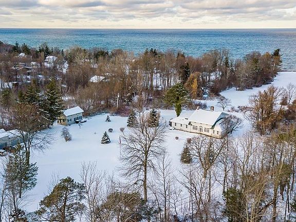 A rare Lakefront offering! Privacy abounds! Just outside the Webster Town line and minutes to Downtown Rochester. This stately home sits on 17+ serene secluded acres with easy access to 310' of beautiful Lake Ontario shoreline. Several hundred yards of beautiful lawn between the house and the lake. Enjoy endless breath taking sunsets. Stone pillars lead you down a 1/4 mile private drive to this historic Arts & Crafts style 4 bedroom, 3.5 bath home. The expansive 30 x 25 Living Room features a stunning stone fireplace. Glass enclosed Sun-Room. Even a Butlers Pantry! Gorgeous pained windows with rich wood molding span the entire home. Also featured is a separate guest house with shuffleboard court and a 4 car garage with caretaker's quarters above.