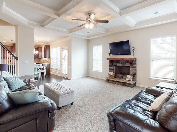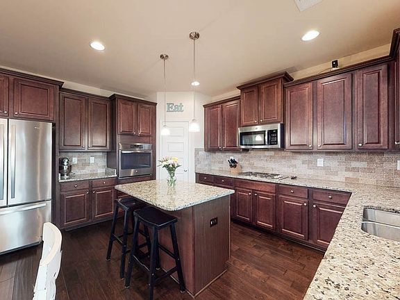 Immaculate 5 bedroom 4 bathroom home with rocking chair front porch! Fantastic upgrades and heavy trim make this home better than new! Welcoming foyer with archways opens to dining room with hardwood floor, wainscoting & coffered ceiling! Spacious dream kitchen has hardwood floor, granite counters, dishwasher, built in microwave, oven, gas cook top plus refrigerator stays! Island! Pantry! Breakfast room opens to living room w/coffered ceiling plus wood burning fireplace! Flex room! Huge media room! Owners suite w/vaulted ceiling, huge closet plus private bathroom w/bathtub & tiled shower w/double shower heads & dual sink vanity! One guest bedroom on main level w/access to guest bathroom w/ceramic tile floor & cultured marble vanity! Vaulted ceilings in the 3 addl guest bedrooms, 1 w/private bathroom & 2 share Jack & Jill bathroom! Laundry room w/washer & dryer negotiable! Covered patio overlooks fenced backyard w/playset! Sprinklers! Great location near I20, shopping & restaurants!