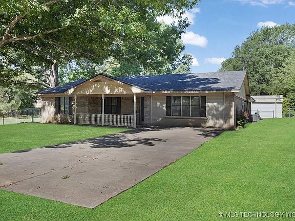 Situated on a generous 1 Acre lot, this charming home offers a perfect blend of privacy, function, and outdoor enjoyment. Mature shade trees in the front & back yard, creating a welcoming canopy over the country front porch, ideal for rocking chairs and morning coffee. The extended driveway provides enough parking and leads to a large, detached metal shop and additional storage shed, offering versatile space for hobbies, equipment, or projects. Backyard is fully fenced and features a beautiful park-like setting with room to roam, garden, or even host gatherings. An outdoor patio features a stone fireplace, bar seating, and space for dining and relaxing. This property provides the rare combination of neighborhood living with room to breathe, enhanced by well-maintained grounds, mature landscaping, and a peaceful backdrop of trees.