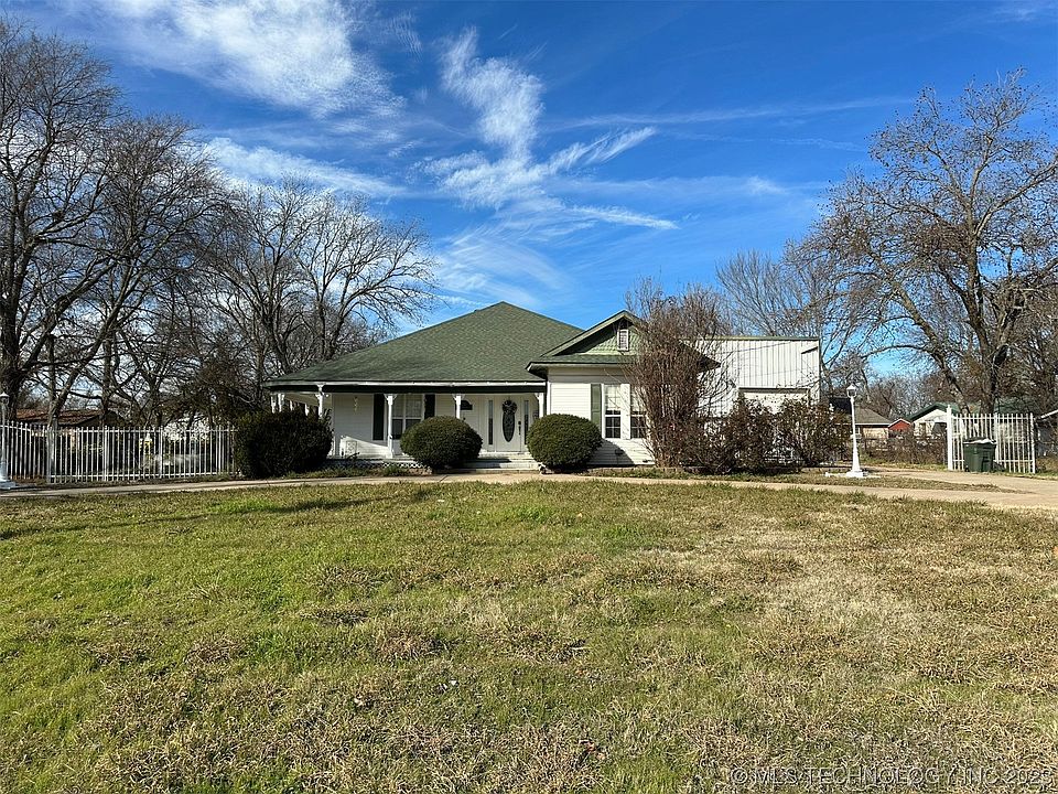 Make an appt. to see this charming 3-bedroom, 2-bathroom single-family home located at 211 N. Choctaw St, Caddo, OK. Built in 1938, this 1,986 sq. ft. residence exudes timeless appeal. The property features a spacious interior with a cozy atmosphere, complemented by original details. Entering by a large entryway, the living room with the cozy gas FP invites you to settle in. The large FDR allows you to entertain a large family or friends. The home underwent updates, ensuring a perfect blend of character and modern convenience. Highlights include a well-maintained kitchen w/ an island and stylish black and white vinyl flooring, comfortable bedrooms, and two full baths. The sale includes all the appliances. The home was a double wood framing system which provides extra natural insulation. Most of the windows have been replaced over the last few years. The property sits on a sizeable .47acre lot, offering potential for outdoor activities or gardening. The roomy 2-car garage w/ attached shop can house your cars/trucks or RV. Above ground pool w/ wooden deck and bar area, storage shed and fenced back yard. Storm shelter. Conveniently situated, it provides easy access to local amenities and community services.