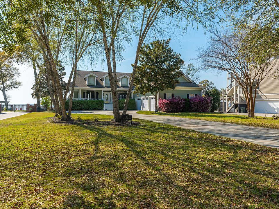 Introducing a captivating lakefront residence nestled on the serene shores of Lake Moultrie, boasting deep water access and breathtaking panoramic views. This home offers a harmonious blend of comfort and elegance, promising a lifestyle of luxury and tranquility.Spanning across two levels, this home features five bedrooms, with three situated upstairs and two conveniently located downstairs. Upon entry, gleaming hardwood floors guide you through the main floor, creating a warm and welcoming ambiance.An expansive sunroom beckons from the rear of the home, complete with a gas-burning fireplace, offering the perfect setting for relaxation and entertaining while soaking in the mesmerizing vistas of the lake.The master suite is a sanctuary unto itself, graced with expansive windows framing tranquil water views. Pamper yourself in the opulent master bath, featuring a generously sized soaking tub, a rejuvenating steam shower, and dual walk-in closets, providing ample storage space and convenience. The heart of the home resides in the spacious kitchen on the main floor, equipped with modern amenities and adorned with gas burners, ideal for culinary enthusiasts and gatherings with loved ones. Downstairs, discover a separate living quarters perfect for a mother-in-law suite or a vacation rental by owner (VRBO). This ground floor oasis features a separate kitchen, living room, private outdoor patio, and flex space, ideal for a gym, plus a serene office space with built-in shelves and captivating water views. Additional amenities include a three-car garage, plus a separate garage for your golf cart, ensuring ample space for vehicles and recreational gear. Outside, a fabulous covered dock awaits, complete with a boat lift, providing easy access to the sparkling waters of Lake Moultrie for endless days of boating and water recreation. Experience the epitome of lakeside living in this extraordinary retreat. Don't miss the opportunity to make this exceptional property your own and indulge in a lifestyle of luxury and serenity. Schedule your private showing today.