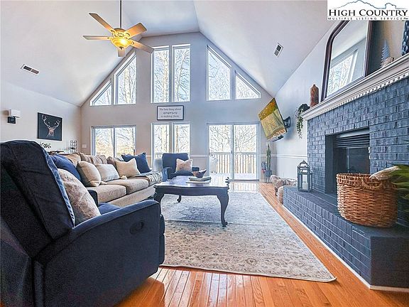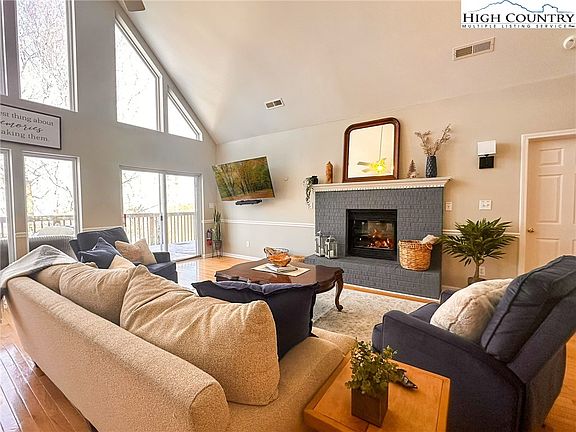 This 5 bedroom home offers flexible accommodation for large gatherings and is being sold fully furnished complete with a successful rental history! The interior boasts expansive high vaulted ceilings and a wall of windows creating an open and inviting space that complements and incorporates the stunning surroundings and natural light. Hardwood floors adorn the main living area, adding a touch of warmth and elegance. Featuring single level living with 3 bedrooms, laundry and kitchen all on the main level. The spacious primary suite complete with a gas fireplace invites relaxation and comfort. Multiple decks offer seasonal mountain views while the hot tub provides a perfect spot to unwind after a day on the slopes. Downstairs you will find 2 additional bedrooms and a large game room featuring a convenient kitchenette adding versatility and functionality to the home's layout. A rare spacious 2-car garage adds additional storage while keeping you out of the snow and is complemented by additional ample parking space for all of your guests. Situated on a double lot, the property showcases a generously-sized flat backyard—an ideal space for outdoor gatherings by the firepit or simply taking in the serene mountain air. Recent upgrades including a new HVAC system and freshly painted interior make this home even more turn key. Embrace the essence of mountain living and indulge in the charm and convenience this Beech Mountain retreat has to offer. Don't miss the opportunity to make this property your own slice of paradise.