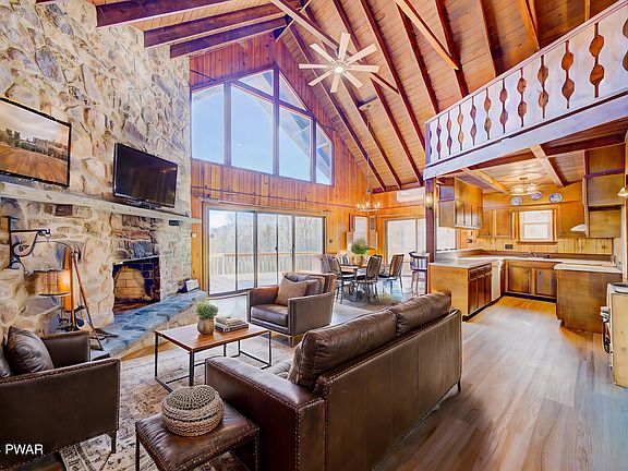 Enjoy amazing views from this open floor plan, 3 bedroom (easily expandable back to 4 bedrooms), 3 bathroom chalet with finished basement! Privately nestled at the end of a cul de sac, you'll enjoy 50+ mile views towards the catskill mountains, while backing up to 87 acres of Tanglwood North Greenbelt, which also backs up to 10,000 acres of PA state gameland. The home also features brand new kitchen appliances, a main level master suite, expansive kitchen/living/dining floor plan, loft for home office, finished lower level family room with gas fireplace, split system AC in living area, and more! Owner of LLC holds PA salesperson real estate license. Available to move in on December 19, 2024 or later. A pet will be considered.