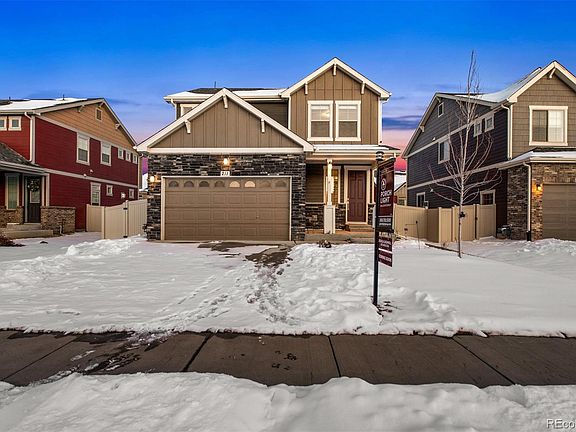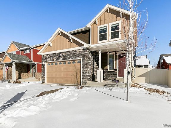 Beautiful, move-in ready home in Erie Highlands. This sought after Platte floorplan has been wonderfully maintained and thoughtfully upgraded. It boasts an inviting layout with stunning engineered hardwood floors across the main AND second levels, plus beautiful tile and stone work throughout. Enjoy summer sunsets on your front porch or cozy up by the fireplace on cool Colorado evenings. Home chefs will love the kitchen featuring stainless steel appliances, gas range, tons of cabinetry, large center island and great natural light. Three bedrooms with second-floor laundry means no more carrying baskets up and down the stairs. Attention to detail throughout. Unfinished basement with rough-in for bathroom--ready for your dream space! Neighborhood has a private pool (home is just 5 blocks away) and clubhouse, multiple pocket parks and trails. Soaring Heights PK-8 School.